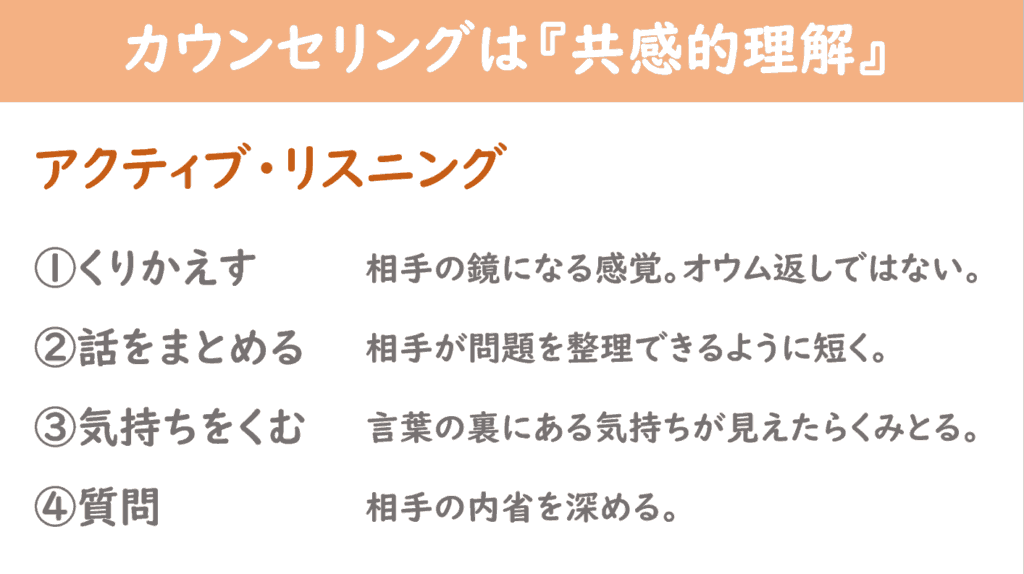 1つ目はアクティブに聴く技法です。アクティブリスニング。