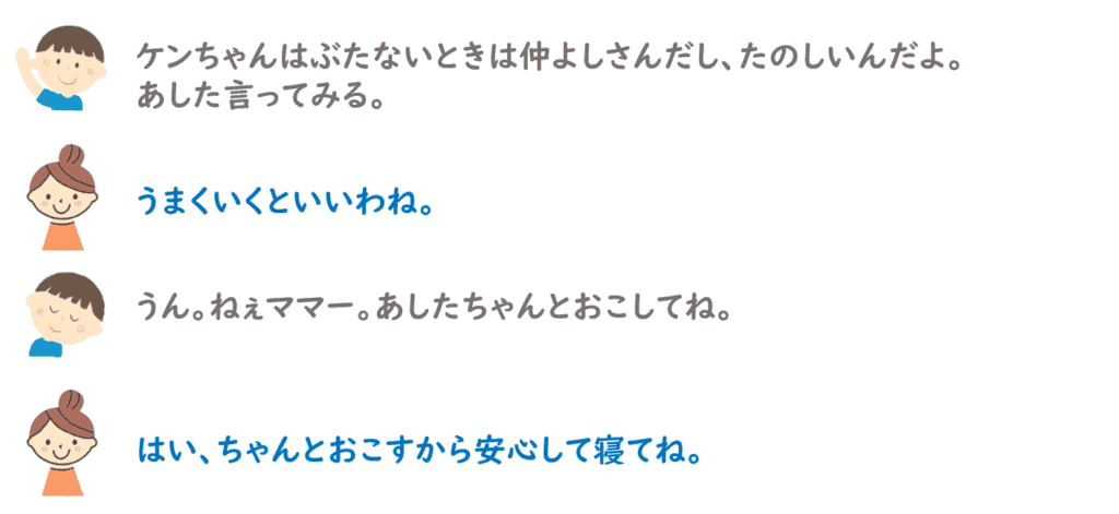 ママが①~④どのアクティブリスニングを行っているのかを探りながら読んでください。